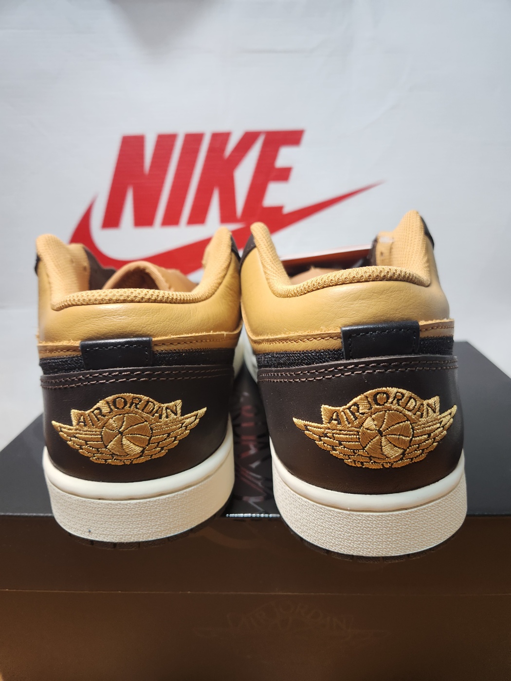 조던 1 로우 SE 플랙스 바로크 브라운은 조던 1 로우의 실루엣을 기반으로 빈티지한 느낌과 고급스러운 컬러 조합을 더했습니다.