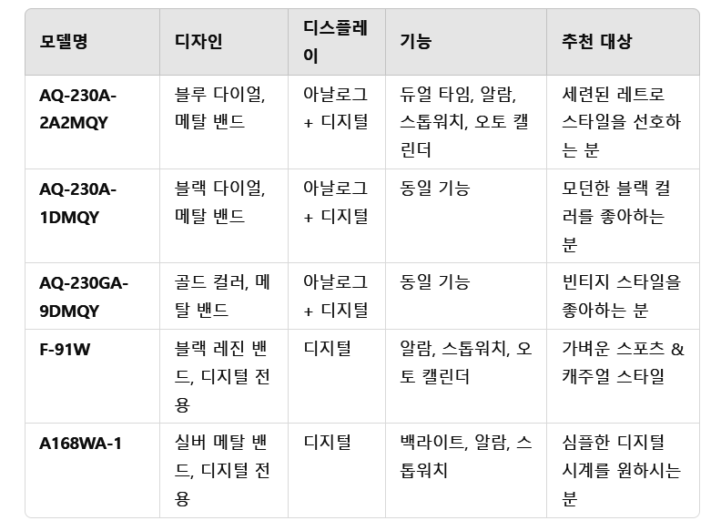 Casio AQ-230A-2A2MQY는 레트로한 디자인과 컴팩트한 사이즈를 갖춘 시계지만, 같은 계열에서 스타일과 기능이 비슷한 모델들이 존재합니다. 몇 가지 비교 모델을 소개합니다.