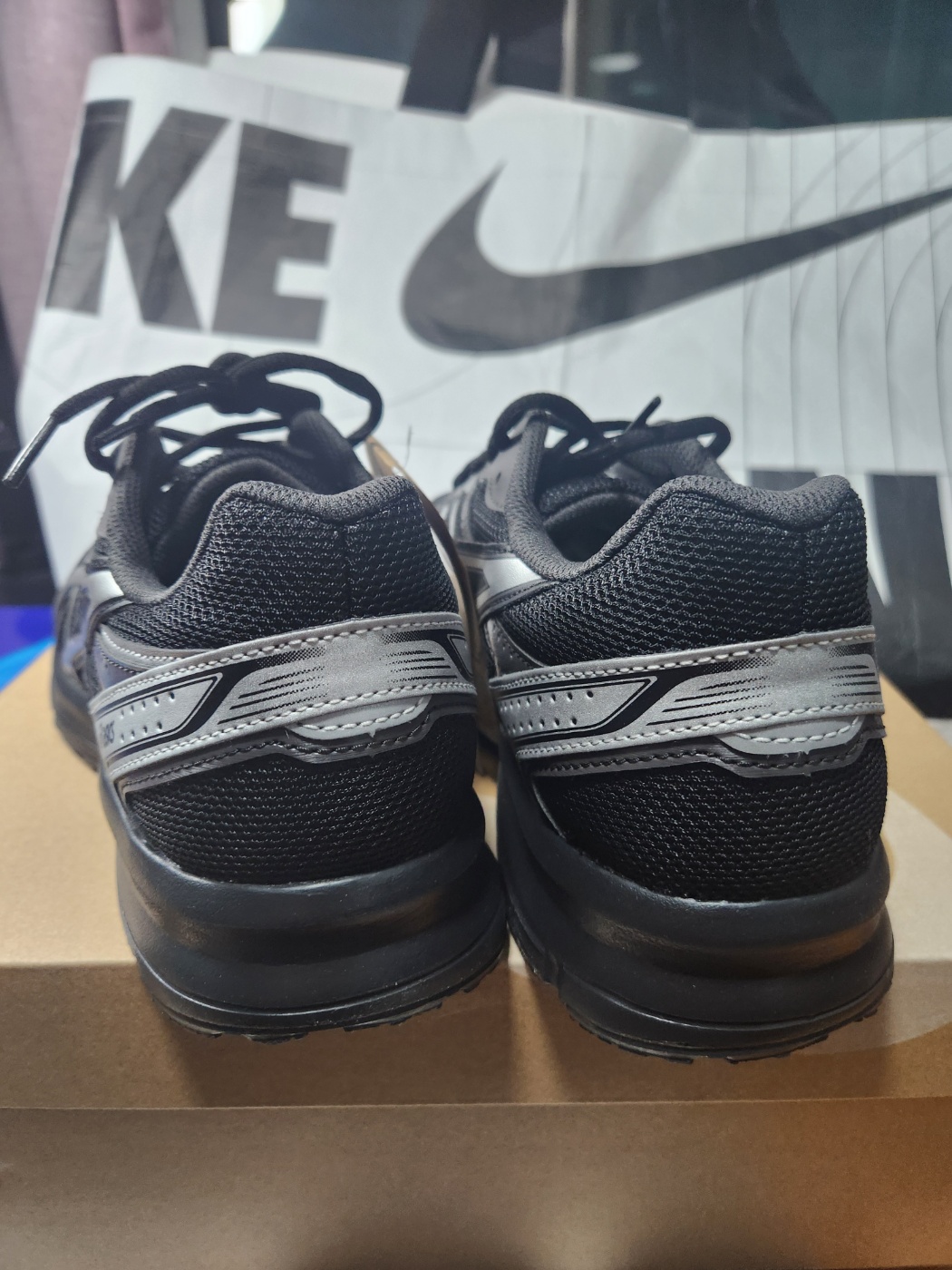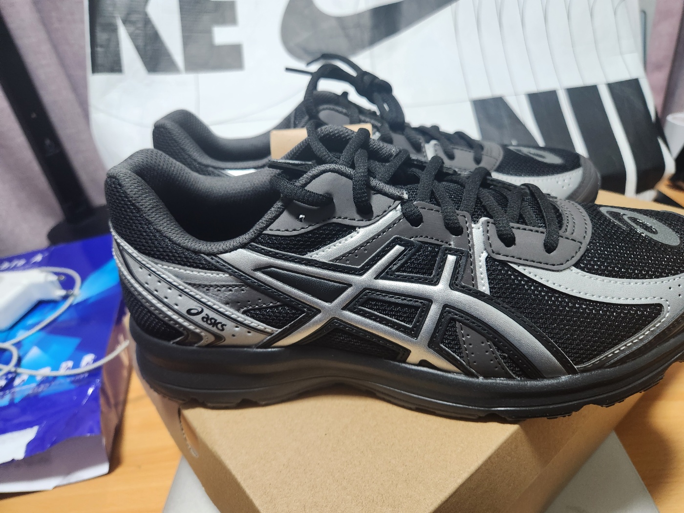 블랙 바탕에 실버로 들어간 아식스 로고는