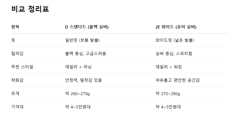 - ✔ 발볼이 평균 → 블랙 퓨어 실버 (D 스탠다드)