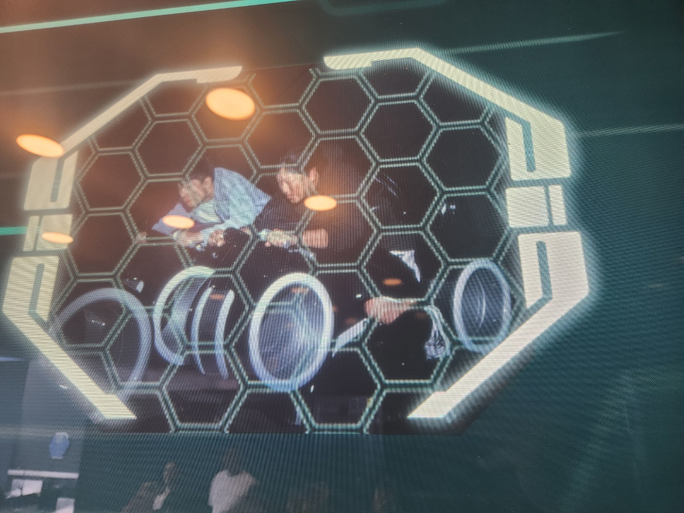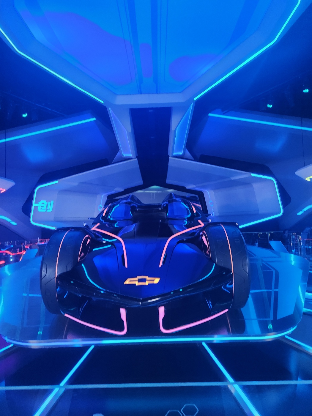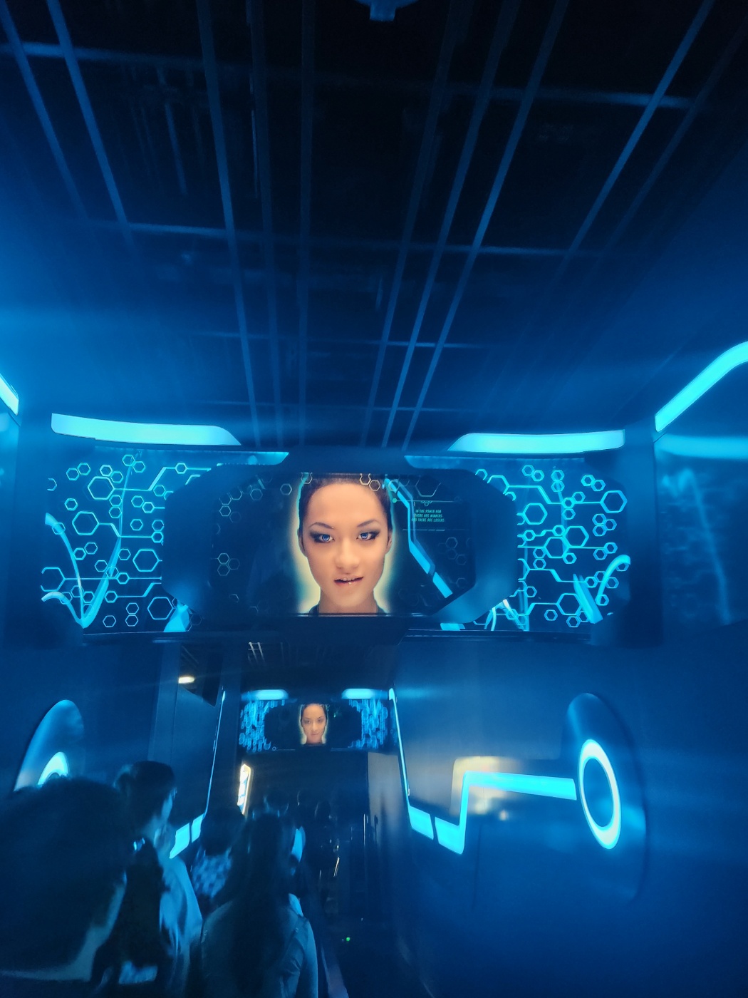 어두운 조명과 푸른 빛, 그리고 ‘트론’ 세계관을 소개하는 디지털 애니메이션 영상과 음향효과가 몰입감을 높이더군요.