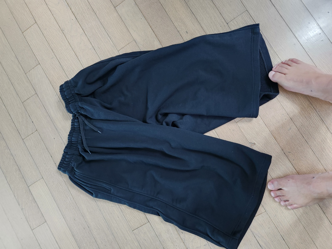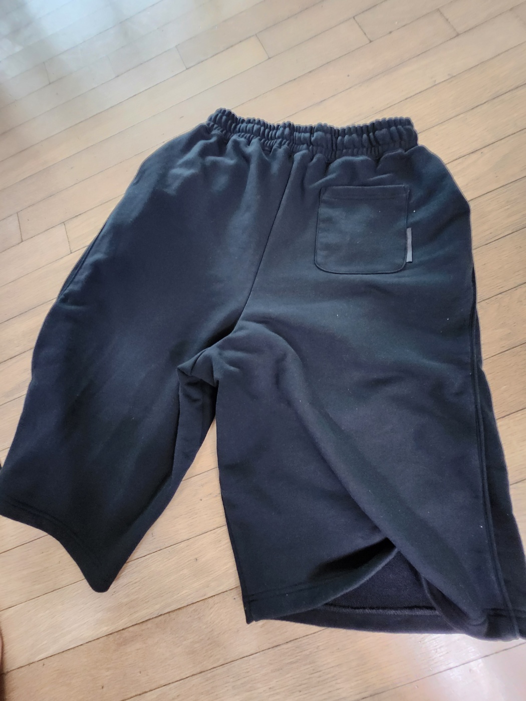 제가 선택한 모델은 블랙 컬러의 버뮤다 스웻 쇼츠입니다. 허벅지를 살짝 덮는 5부에 가까운 기장감이며, 밑단이 살짝 퍼지는 듯한 실루엣을 가지고 있습니다. 일반적인 스웻 팬츠 소재보다는 조금 더 힘이 있고 탄탄한 원단이 사용되어 있어, 흐물흐물한 느낌 없이 형태감이 잘 유지되는 점이 좋았습니다.