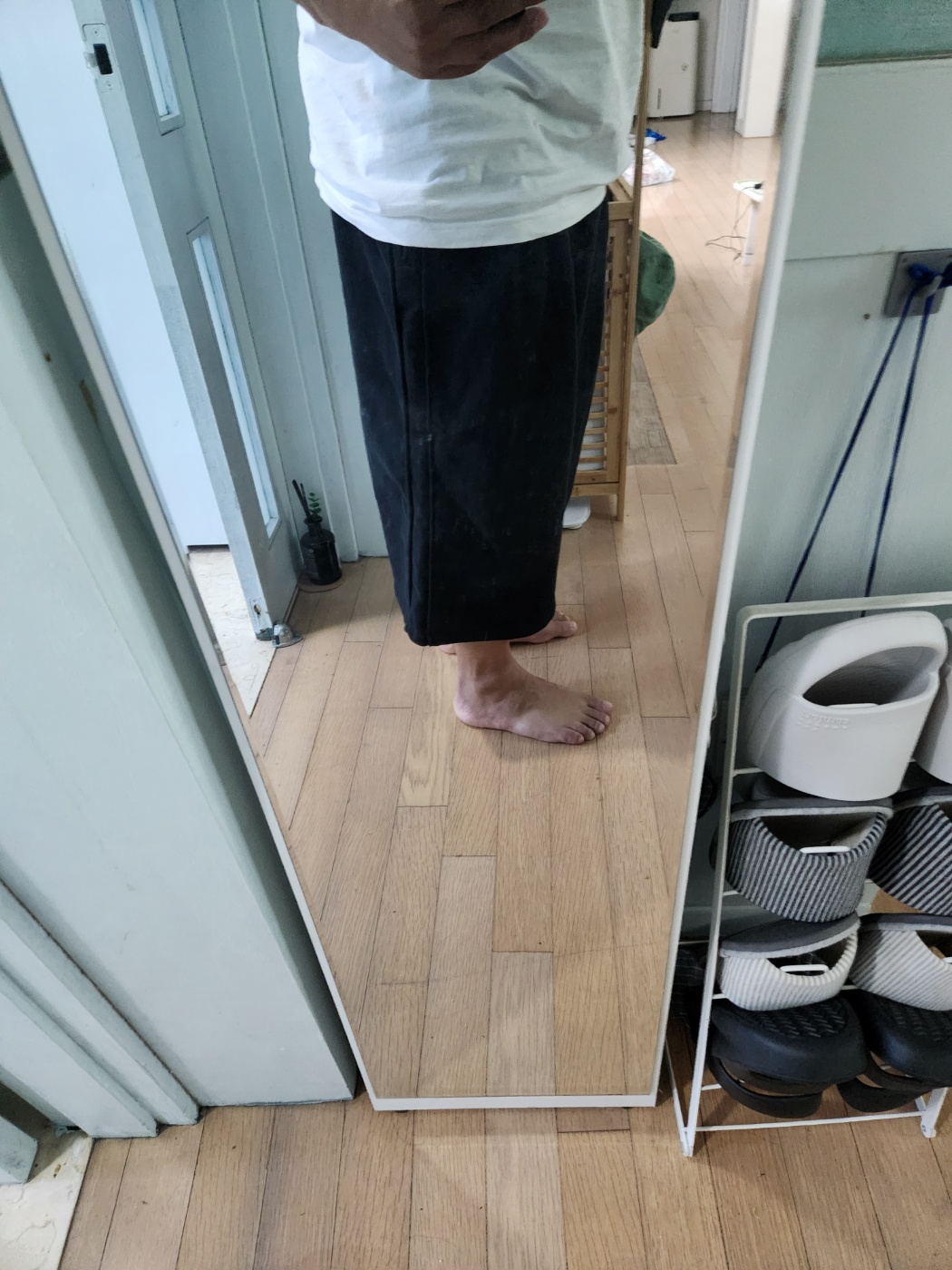 블랙 컬러는 역시 옳습니다. 슬리퍼, 운동화, 샌들 등 어떤 신발과도 무난하게 잘 어울리고, 상의도 흰색, 그레이, 네이비 등 다양한 톤으로 조합하기 쉬워서, 중년 남성의 데일리웨어로 제격입니다