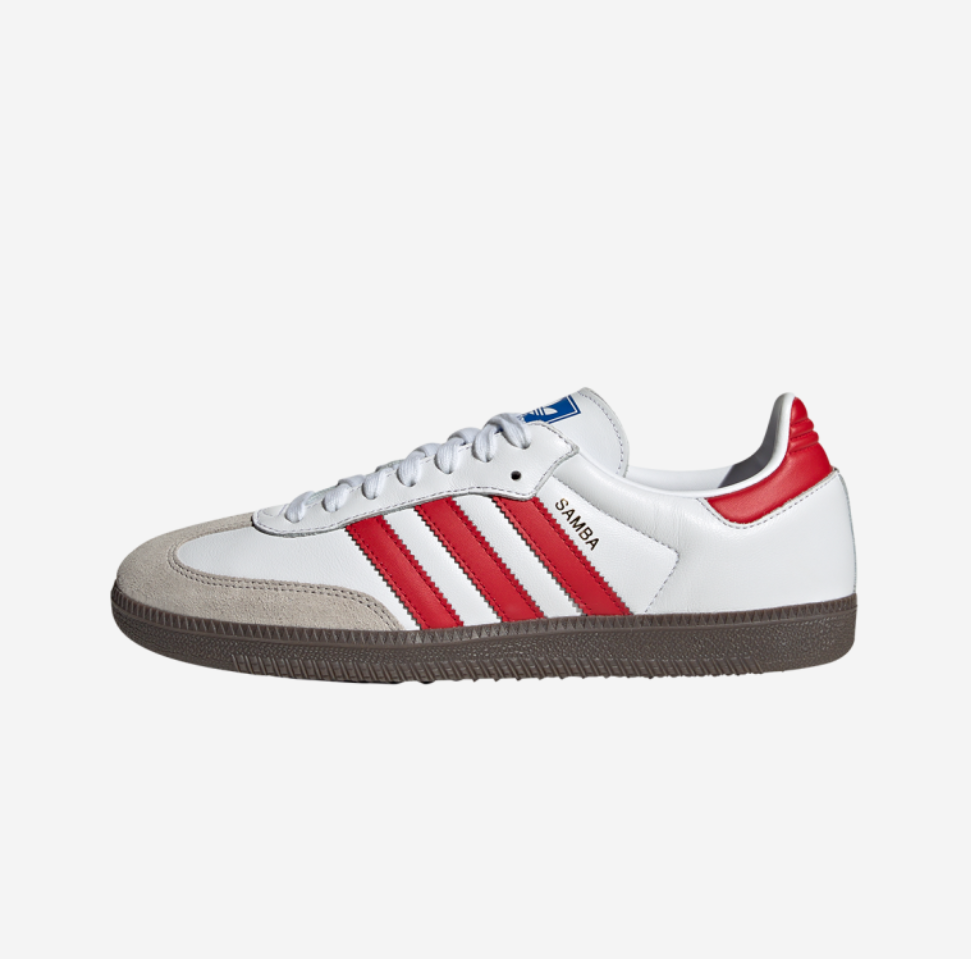 대부분의 삼바 OG가 차분하고 빈티지한 색조를 유지한 반면, 이 모델은 측면의 삼선(Three Stripes), 힐탭, 텅 라벨에 이르기까지 강렬하고 선명한 붉은색을 배치하며, 시선을 단번에 사로잡습니다.