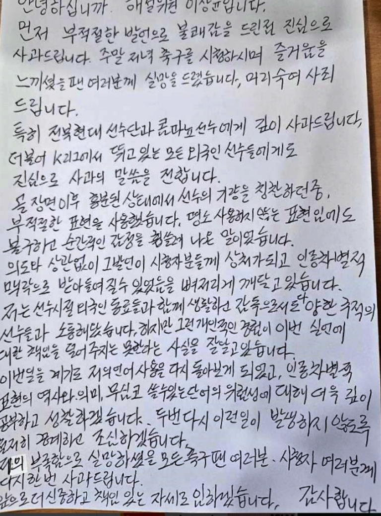 다행스럽게도 이상윤 해설위원은 사건 발생 하루 만에 자신의 SNS에 자필 사과문을 게재하며 책임을 인정하고 진심 어린 사과를 전했습니다. 특히 전북 현대 구단과 콤파뇨 선수에게 직접 사과한 점, 그리고 K리그에서 뛰는 모든 외국인 선수들에게도 사과의 메시지를 남긴 것은 그의 진정성을 보여줍니다.
