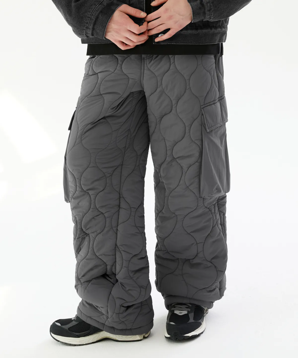 기온이 영하로 떨어지고 매서운 바람이 불어오는 계절, 일반적인 바지로는 도저히 버틸 수 없는 순간이 찾아옵니다. 하지만 둔하고 무거운 패딩 바지는 활동성을 떨어뜨리죠. 오늘은 이 모든 고민을 해결해 줄 **'트릴리온 퀼팅 패디드 워머 밴딩 카고 와이드 팬츠 그레이'**를 소개합니다.