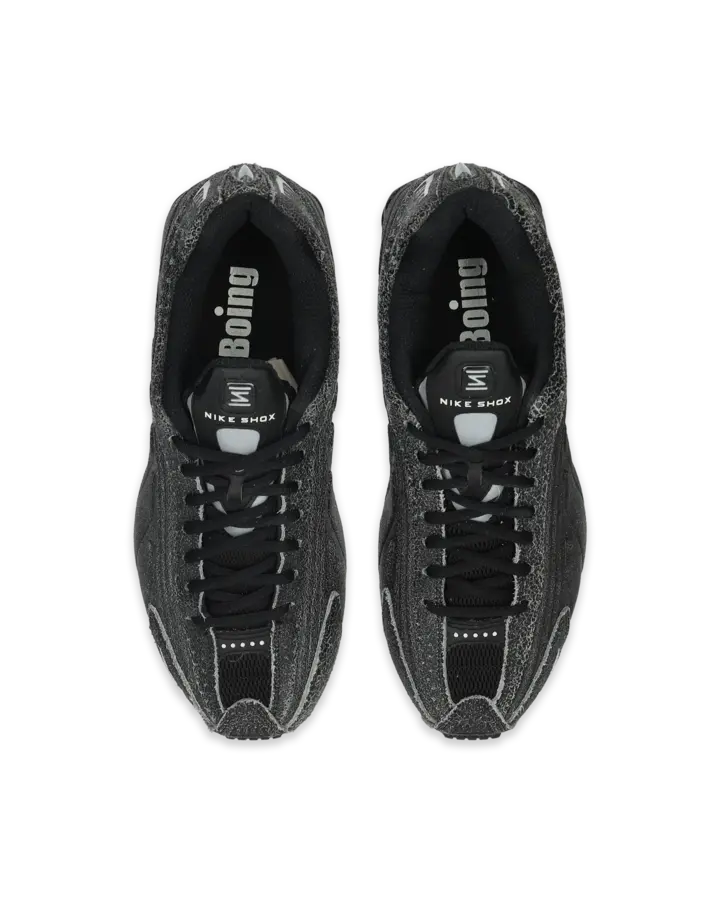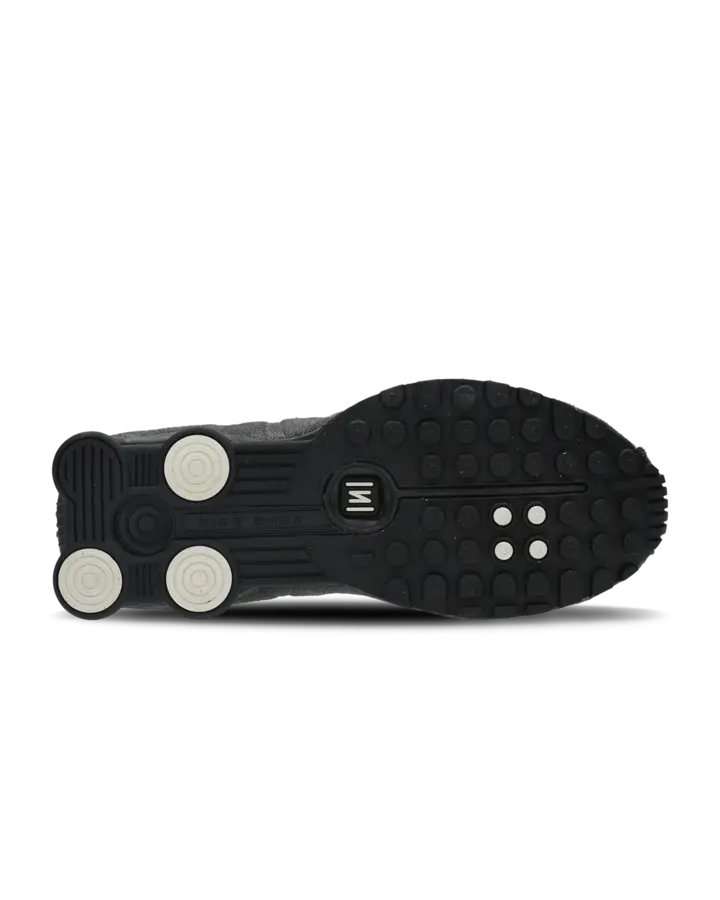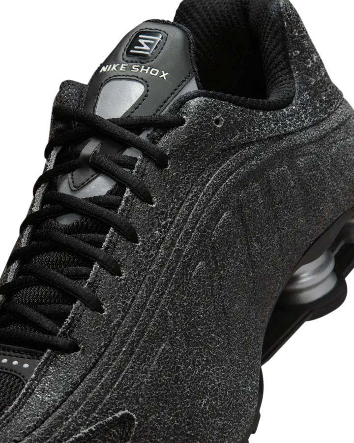 이번 나이키 샥스 R4 QS 블랙은 전체적으로 블랙 컬러를 중심으로 구성돼 있어 샥스 특유의 미래적인 디자인을 한층 더 세련되게 만들어 줍니다. 유광과 무광이 적절히 섞인 어퍼는 조명과 각도에 따라 다른 분위기를 연출해 주며, 단순한 블랙 스니커즈와는 확실히 다른 인상을 줍니다.
