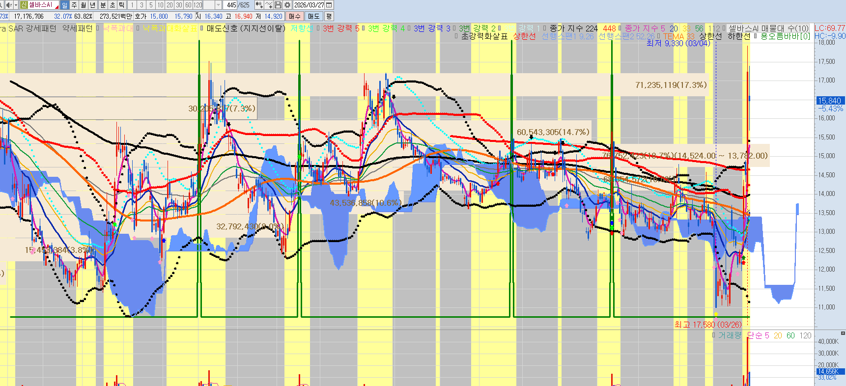 단순 반등이라고 보기에는 너무 강한 시그널이 나왔습니다. 특히 3월 26일에 나온 장대양봉과 거래량은 차트를 보는 사람이라면 누구나 한 번쯤 다시 보게 되는 구간입니다. 하루 만에 20% 넘는 상승과 함께 터진 거래량은 흔한 움직임이 아닙니다. 이건 분명히 ‘의미 있는 돈’이 들어왔다는 신호로 해석하는 것이 맞습니다.