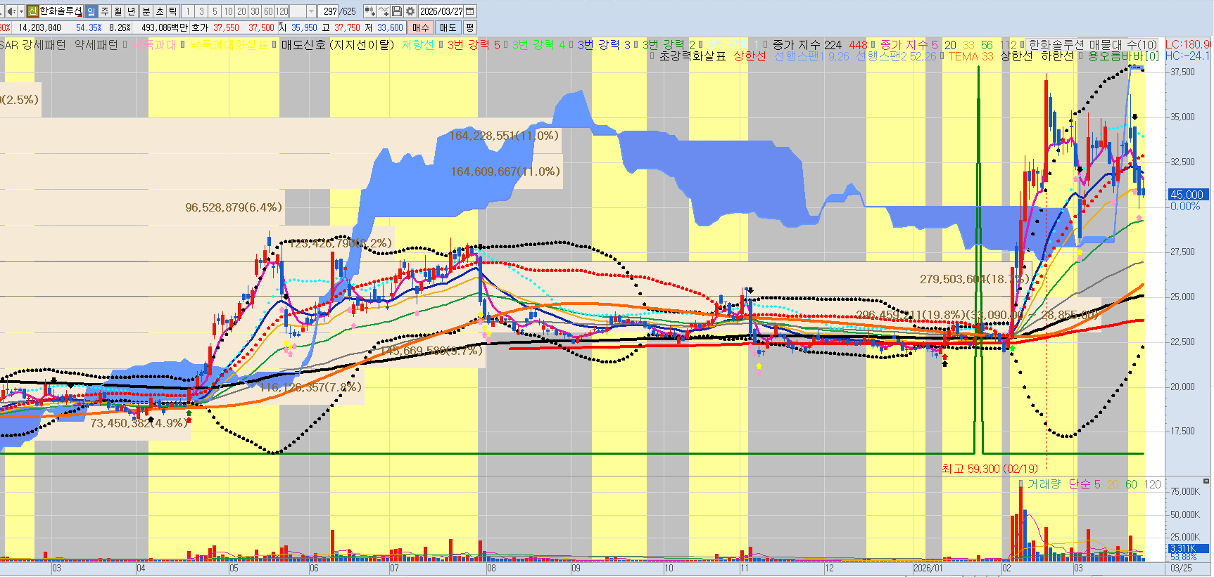 | 장기 (1년 이상) | 65,000원+ | 전고점(59,300원)을 돌파하고 신고가 영역으로 진입하는 수치입니다. 태양광 섹터 전반의 멀티플 리레이팅이 필요합니다. |