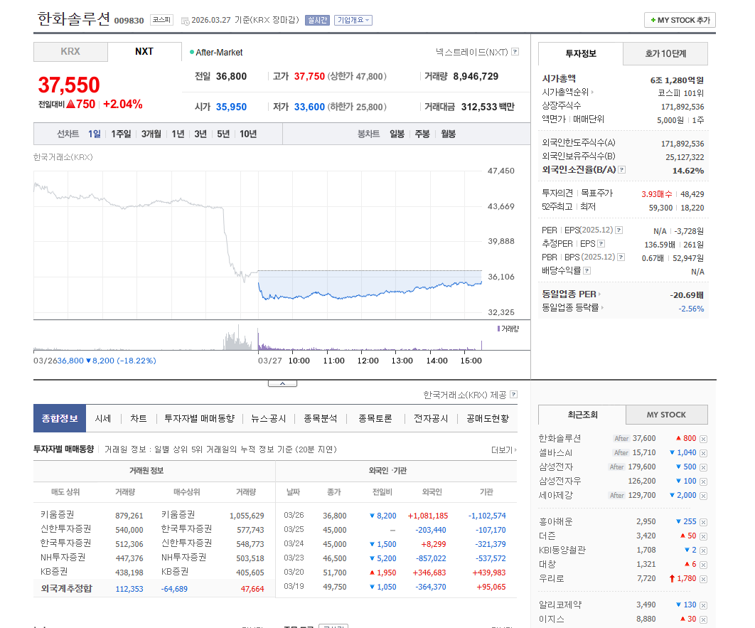 최근 시장에서 가장 변동성이 컸던 종목 중 하나가 바로 한화솔루션입니다. 단기간에 -18%가 넘는 급락이 나오면서 투자자 입장에서는 상당히 당황스러운 흐름이었는데, 바로 다음 날 반등이 나오면서 “이게 바닥인가”라는 고민이 깊어지는 구간입니다.