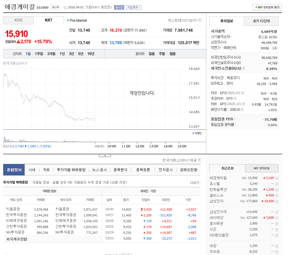 요즘 시장을 보면서 가장 눈에 띄는 종목 중 하나가 바로 애경케미칼입니다. 단순한 반등 수준이 아니라, 흐름 자체가 바뀌는 느낌을 주고 있어서 개인적으로도 꽤 관심 있게 보고 있는 종목입니다.2026년 4월 1일 기준으로 보면 애경케미칼 주가는 전일 대비 약 15% 이상 급등하면서 15,900원대를 기록했습니다. 숫자만 보면 “이미 많이 오른 거 아닌가?”라는 생각이 들 수 있지만, 차트를 조금만 깊게 들여다보면 단순 급등이 아니라는 걸 확인할 수 있습니다.먼저 기술적 흐름부터 보면, 가장 눈에 띄는 건 거래량입니다. 보통 이런 급등이 나올 때 거래량이 동반되지 않으면 ‘단기 급등 후 급락’ 패턴으로 끝나는 경우가 많습니다. 그런데 이번 상승은 거래량이 폭발적으로 붙으면서 올라온 케이스입니다. 이건 의미..